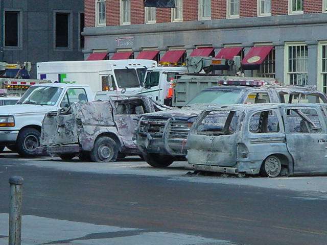 What burned hundreds of cars, some more than half a mile away from the WTC?