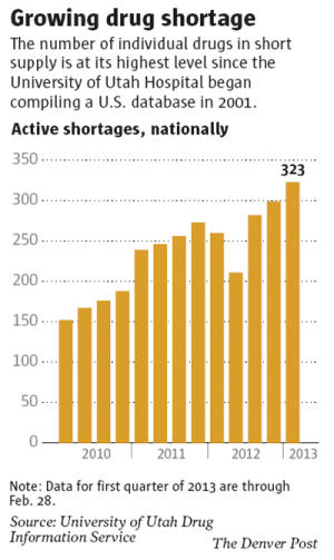 Reader and MD Francois T passed along this sighting from the Denver Post, of hospitals having trouble getting critical medications. The number in scarce supply is 323, the highest level since the database was started in 2001.