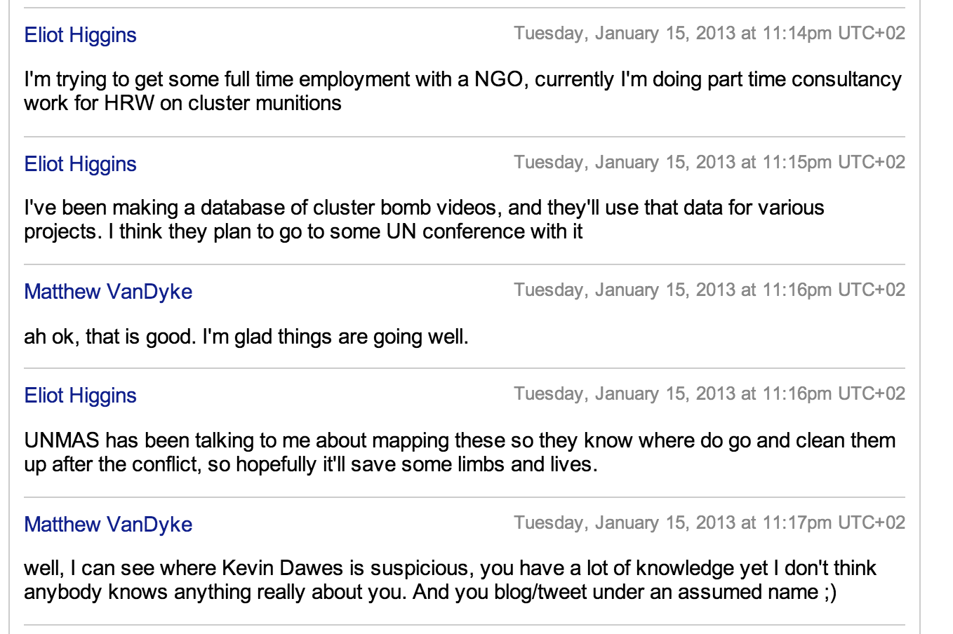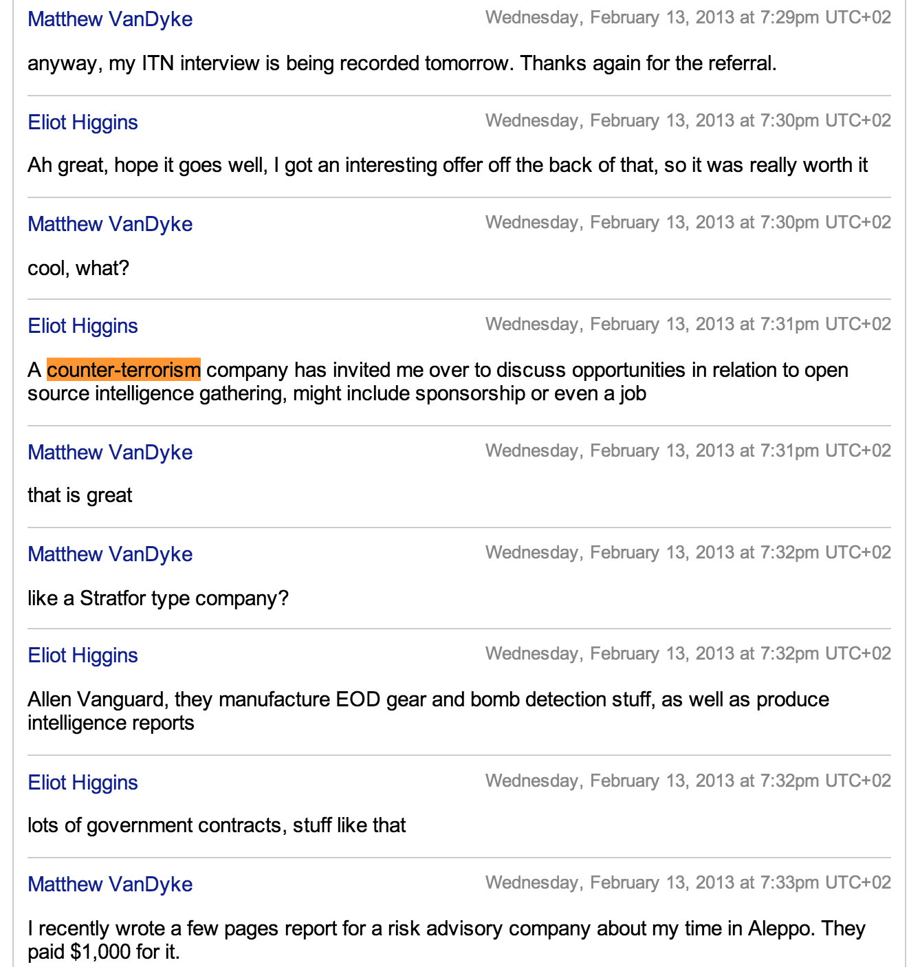 The e-mails reveal multiple correspondences regarding chemical weapons falling into the hands of terrorists aimed at using them in a false flag operation, Higgins' and Van Dyke's mutual "benefactor" located in Virginia, "near DC" (Langley, Virginia?), and job offers for Higgins from NGOs and a defense contractor involving "open source intelligence," the new buzzword used by Higgins and Whitaker in regards to the new form of propaganda they both participate in.
