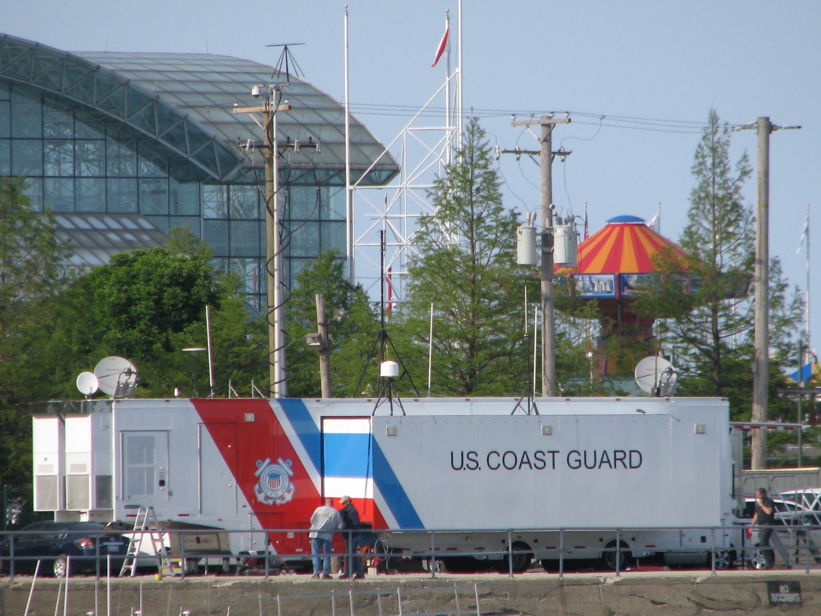 NATO Command and Communications operation number 4 is at the Burnham Harbor parking lot just across the way from Northerly Island and adjacent to the old McCormick Place. In the photos below, we see various members of the military / Homeland Security guarding the operation, meeting with superiors. We also see the greater cross section of the operation to include their communications and surveillance equipment which includes cellular and microwave frequency operation.