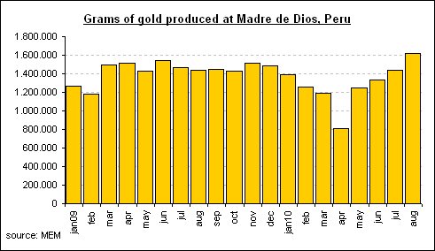 ...that the Madre De Dios (MDD) region produced 1,618,380 grams (52,038 ounces) of gold in August 2010, a new monthly production all-time record for the region. Production is up 12.7% YoY and at current spot prices that gold is worth some $68m or so....for one month.